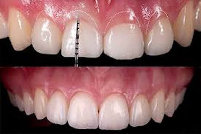 • Se utilizan guías prefabricadas para eliminar la cantidad adecuada y permitida de encías y, en algunos casos, puede ser necesario eliminar un poco de hueso adyacente para evitar que las encías vuelvan a crecer a su posición original, esto lo determinará el periodoncista.